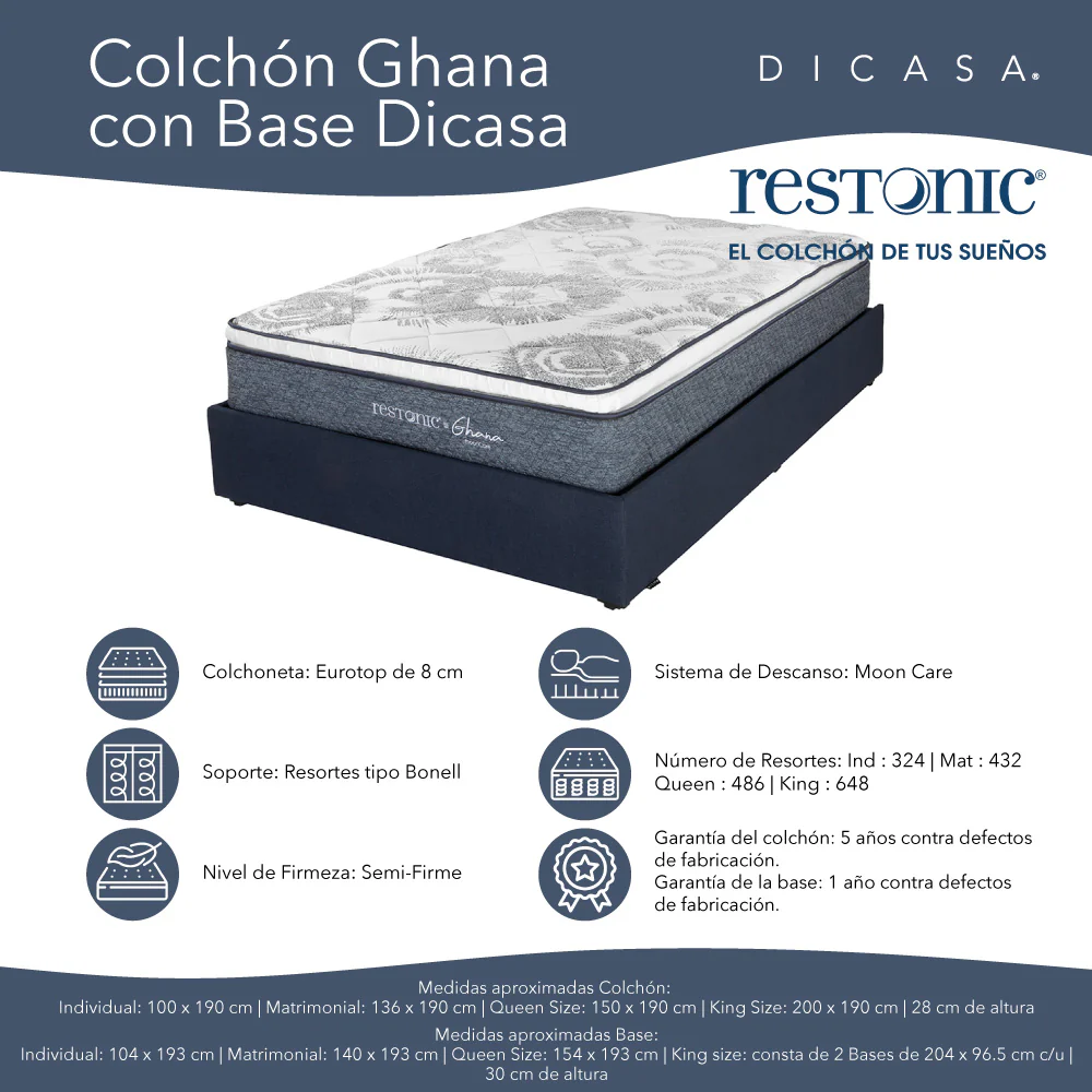 - Colchón Restonic Ghana proporciona un soporte Semi-Firme durante el descanso. Resortes tipo Bonell. Colchoneta Euro Top 8 cm, que añade una capa de suavidad, brindando una experiencia de descanso cómoda y equilibrada.