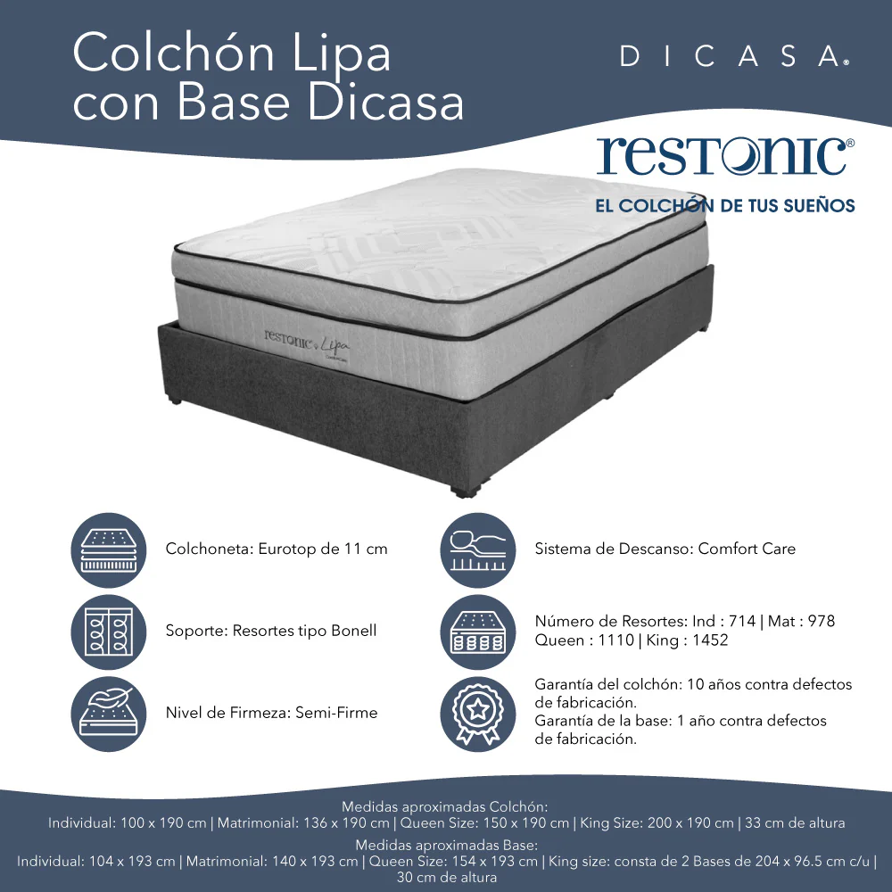 - Colchón Restonic Lipa combina suavidad y soporte. Diseñado para ofrecer un nivel de confort Semi-Firme. Resortes tipo Bonell. Sistema Mini pocket encased pequeños resortes embolsados con un marco de espuma para mayor estabilidad y soporte. Colchoneta Euro Top 11 cm.